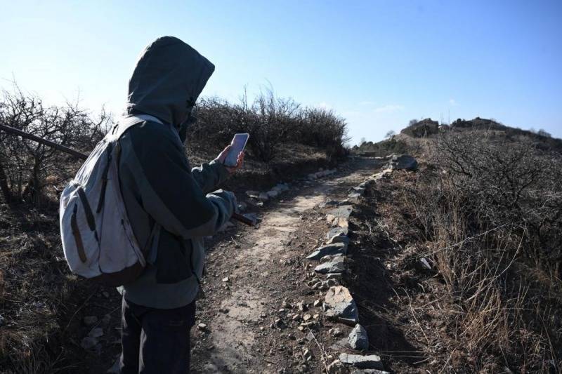 文史爱好者在山脊寻找刻石