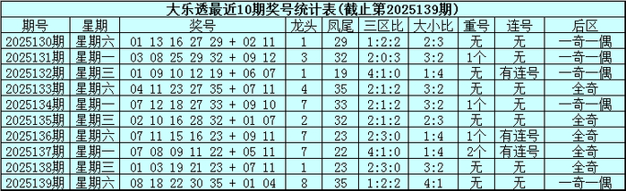 大乐透第2025139期奖号为:08、18、22、30、35+01、04。其中前区三区比为1:2:2,大小比为4:1,没有出现重号,没有出现连号,后区为一奇一偶号码。